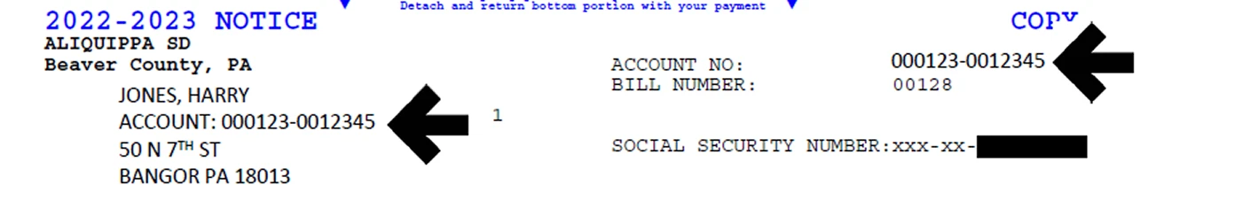 If you received a Per Capita Tax Bill, Occupation Tax Bill, Real Estate Tax Bill / Letter and / or Utility Bill and want to make an online payment, please note you must enter the 6 digits before the dash, the dash and the 7 digits after the dash.  If your bill does not have this, please add leading zeros.  Example:  If the account # reads 12345-12345, on the online payment screen you would need to enter 012345-0012345.